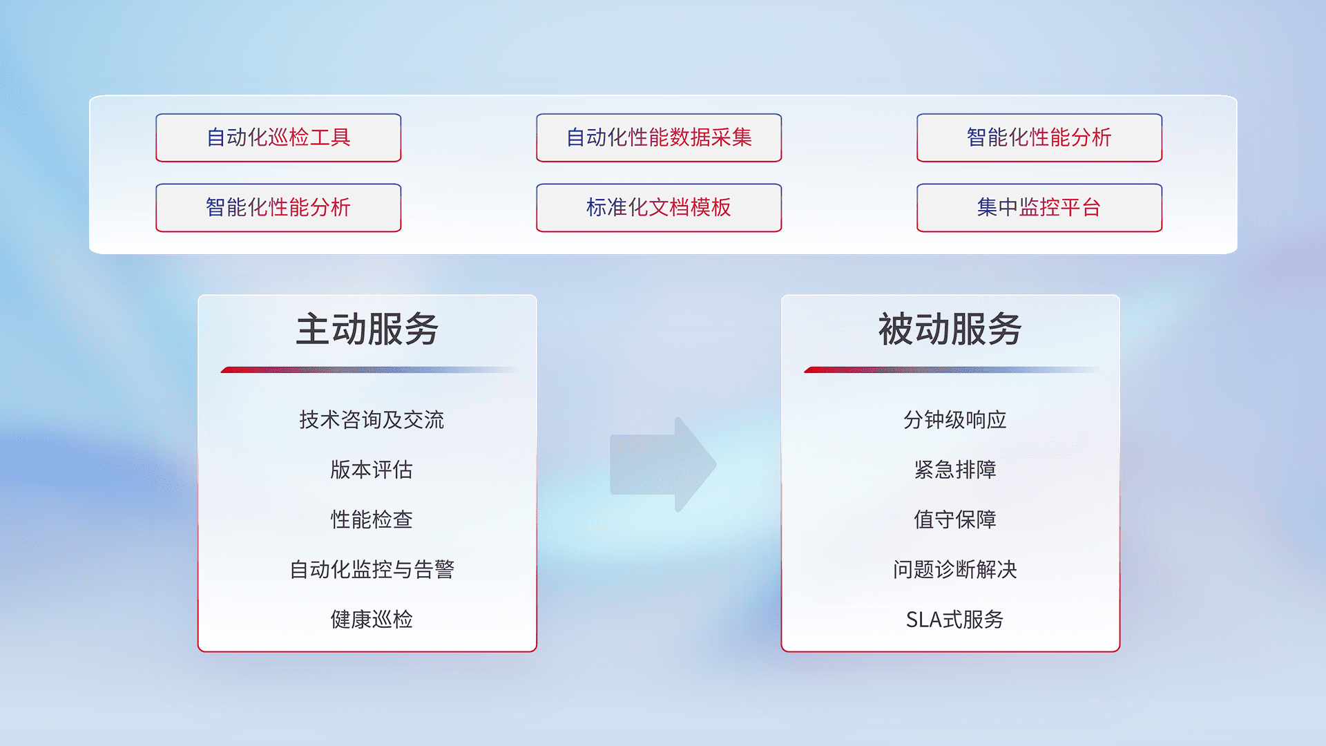 智能化工具和标准化文档,,保障服务质量,,,提供主动服务(包含技术咨询、、、版本评估、、、性能检查、、自动化监控与告警、、、、健康巡检)和被动服务包含(分钟级响应、、、、紧急排障、、、、值守保障、、问题诊断解决、、、SLA服务)。。。。